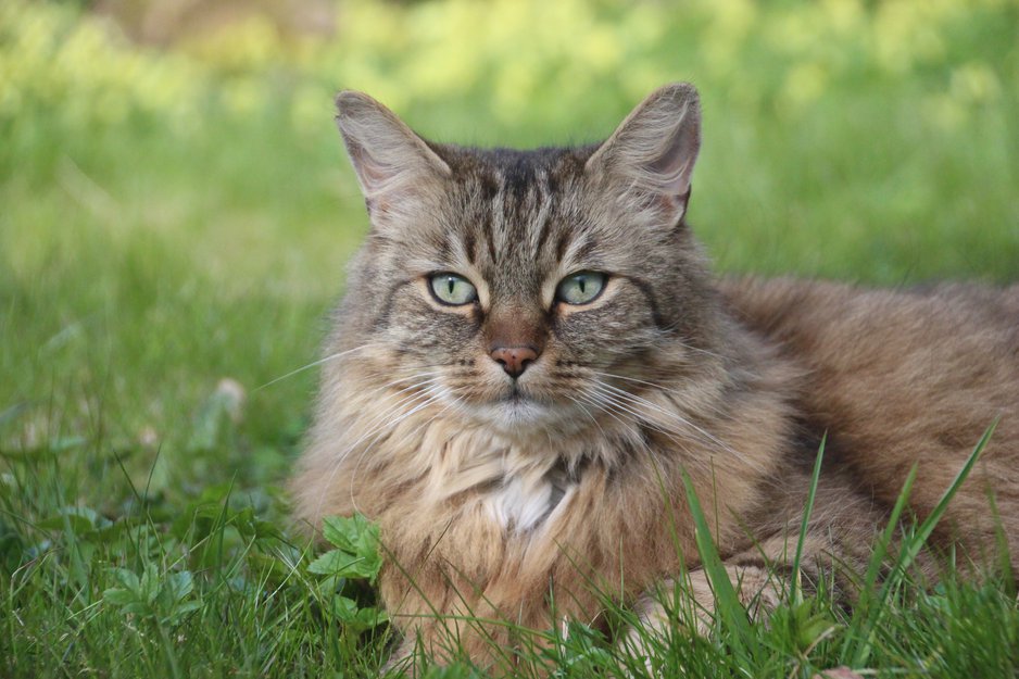 Langhåret tabbykatt, har et rift i høyre øret og en liten svart prikk midt på nesa.
