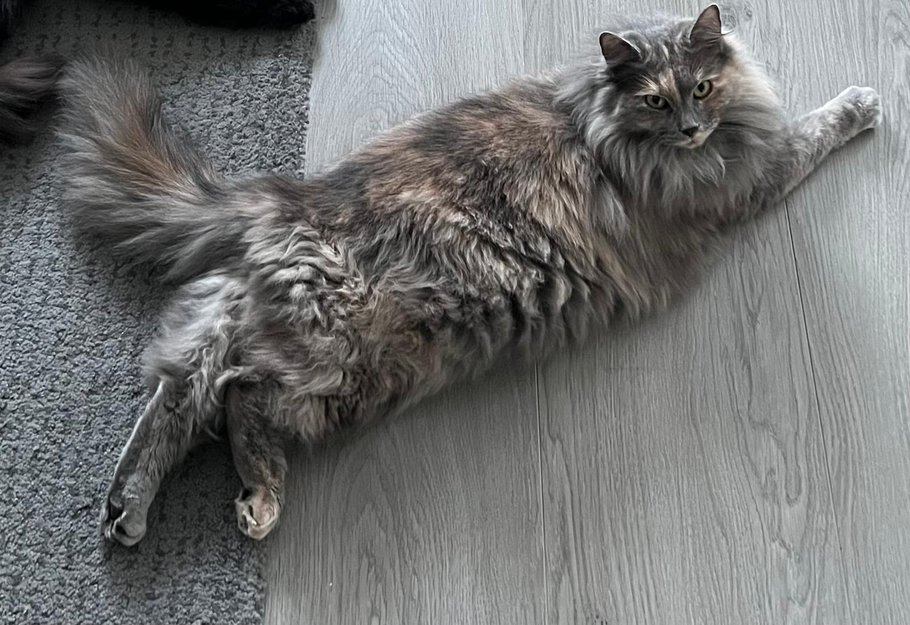 Maya er en nesten 2 år gammel fluffy hunnkatt av rasen norsk skogkatt, med lang grå pels med brune og svarte flekker, og hun har en stor, buskete hale.