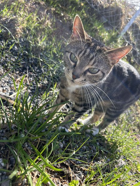 Veldig liten og tynn katt, snart 3 år gammel men alltid vært veldig liten for alderen. Store grønne øyne og 4 hvite poter. Mørke farger og hvitt bryst. Lyder navnet Vitani og er utrolig kjærlig. Kommer bort og koser og er veldig nysgjerrig. Hun er litt sassy så hun eier verden hun går på men utrolig snill og trygg katt. Er nylig sterilisert så stinga kan kanskje fortsatt være kjennbare under magen - hvertfall lite pels etter barberingen