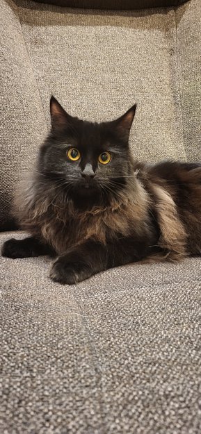 Sort med lysere parti rundt hals og forpoter. Har veldig fluffy og fin hale. Har barbert parti på ene forpote og på mage etter sterilisering i starten av april.