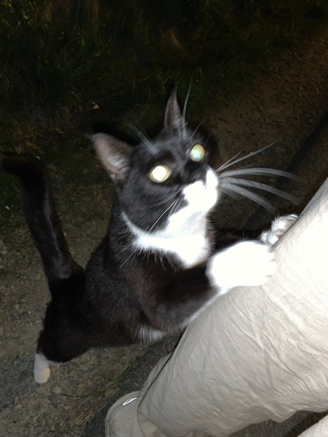 Sett denne katten tre dager på rad i Rundeskogen på Lura. Korthåret svart med hvitt på haken og litt på brystet/magen. Og hvite poter. Virker tam.