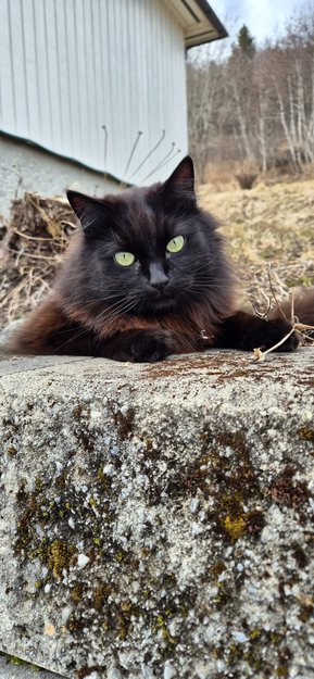 Svart, langhåret hannkatt. Pelsen får et brunskjær i sommerhalvåret.