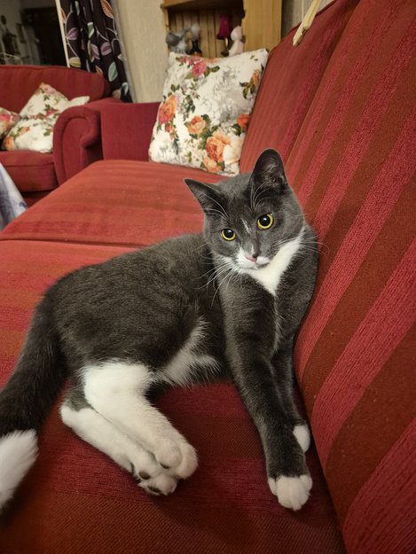 Hun har hvite på puten både framme og bak, hun har hvit på toppen av halen og hun har hvit på halsen og på magen. Hun veldig snakkete pus, men veldig redd fremmede.