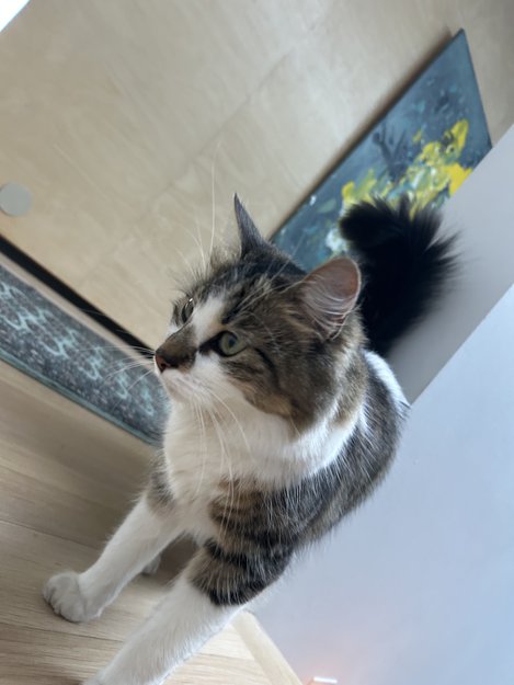 Katten dukket plutselig opp fredag. Ser ut som en halvvoksen katt - vi tror at det er en jente. Katten er tynn og fremstår som veldig sulten. Den er tillitsfull og kontaktsøkende. Vi har gitt den mat og vann.