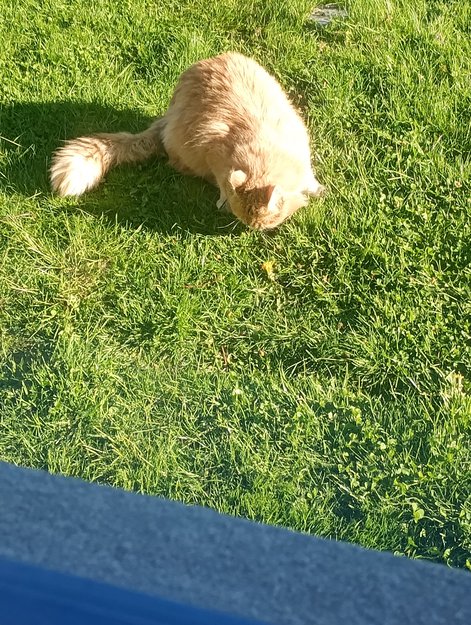 Gått rundt her lenge.virker veldig sulten. Kommer hit innimellom.Den er litt langhåret.Noe hvitt på halen og rundt munnen.Er sky så får ikke tydelig bilde.Vet ikke om den kan bo i nabolaget.Var veldig sulten