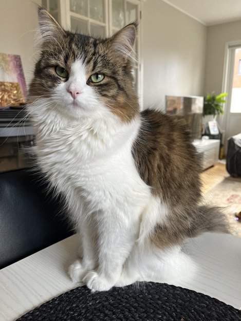 Katten er hvit og grå, litt oransje. Hvit flekk på ryggen. Sibir skogkattmix. Langhåret. Klippet hår på rumpa og begynnelsen av halen.