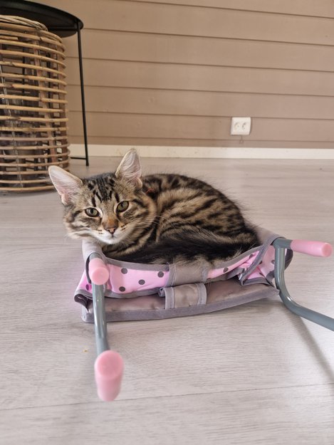 Hun har ett oransje halsbånd på seg, hun er veldig kosete og tam. Hun er ikke så stor, er kattunge.