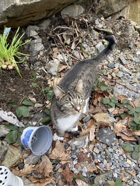 Etter et par timer, i barnehagen ved siden av kirken, så vi henne plutselig. De hvite sokkene på de enorme potene, var ikke til å ta feil av. Dette var babyen. Vi lokket og pratet, og katten svarte. Hun kjente stemmene våre igjen, og da hun våget seg nærmere for å spise, snuste hun på oss kjapt, og husket hun oss. Likevel tok det 2 dager å få hennes tillit såpass at vi kunne lure henne inn i fangstburet vi hadde lånt av veterinær.
