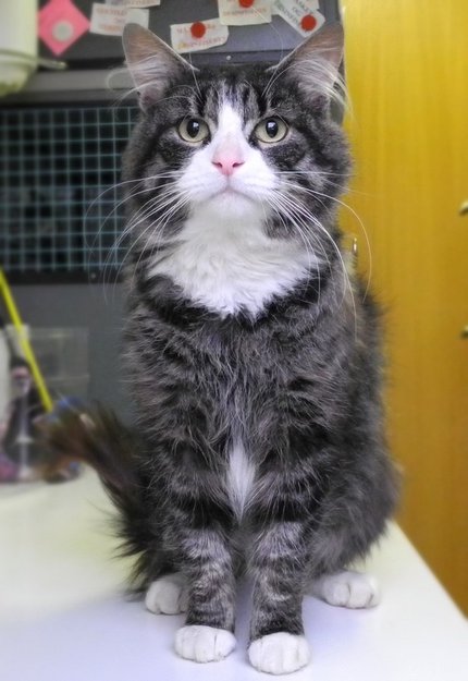 Flott, stor hannkatt, ca 1 år gammel. Gråstripet, men hvit i ansikt, på hals og litt nederst på brystet. Hvitt på potene. En trygg og snill type.