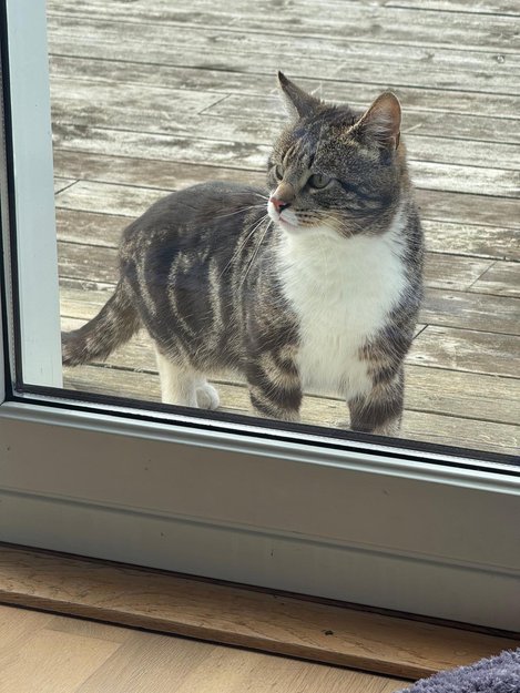 Grå katt med karakteristiske svarte striper funnet på Skogn. Den oppholder seg ved vårt hus på Støreshøgda, i nærheten av Gråmyra. Den er ikke chippet.