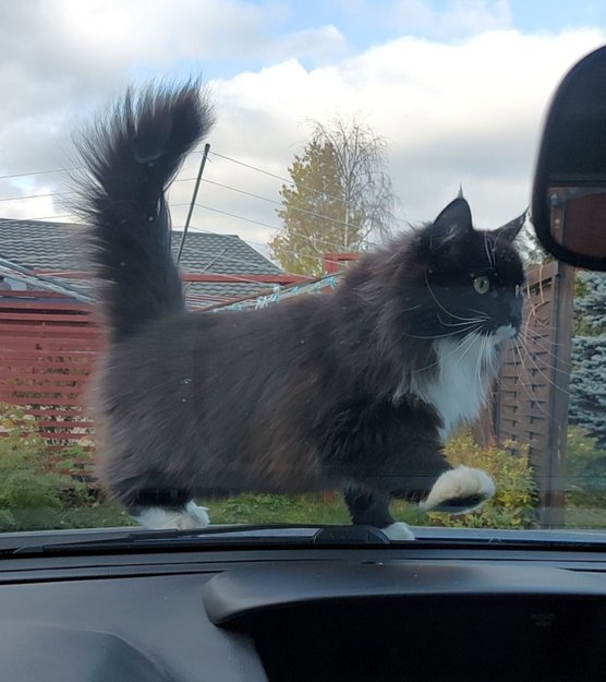 Halvt skogskatt, på størrelse med en stor huskatt. Svart lurvete pels med hvitt på føtter og bringe.