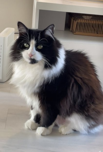 Langhåret svart og hvit pus. Litegrann brunskjær i pelsen innimellom. Hvit under hake og på brystet og mage. Hvite poter. Svart ellers. Mangler noen tenner grunnet en tidligere ulykke. Fluffy hale. Akkurat nå har hun barbert mage.