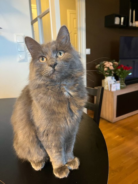Er 2 år gammel, chippet og kastrert. Han er en snill og rolig katt, litt redd ukjente mennesker. Holder til i nylundtunet 23 og oppholder seg helst rundt område, kommer alltid inn om morningen/ kvelden og blir inne noen timer for å sove/spise mat.
