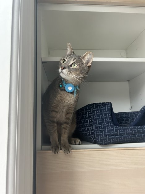 Grey with light underside and pattern below. Grey/green/yellow eyes. Tattoo of letter ‘H’ in the ear from the shelter. Blue collar with a bell.