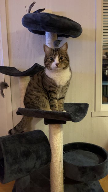 2 år gammel hannkatt. Spraglete, med svart, brungrå og hvite områder.