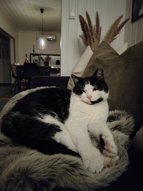 Han er sort og hvitspraglete på sidene. Hvit i hele brystet og under magen. Hvit tykk stripe i panne og en sort flekk under haka. Hvite poter med en liten flekk på fremre venstre labb.