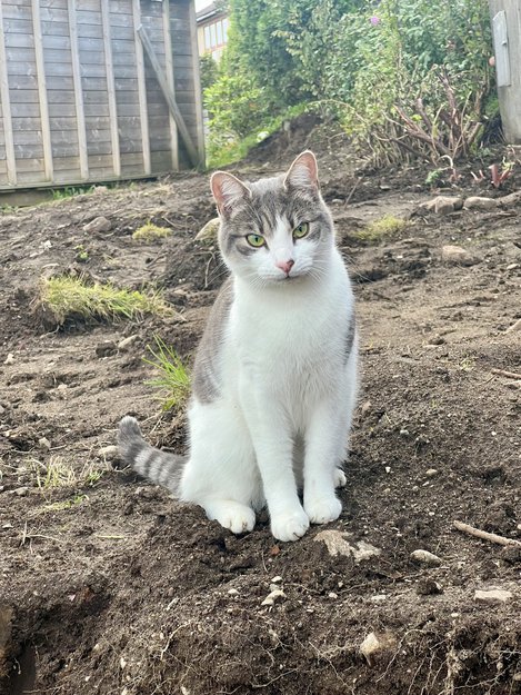 Katten lystrer navnet Mio. Er 3 år. Vennlig men litt skvetten. Han har hvit pels på bein, mage og ansikt. Gråstripet på rygg, hode og hale, hvit haletipp.