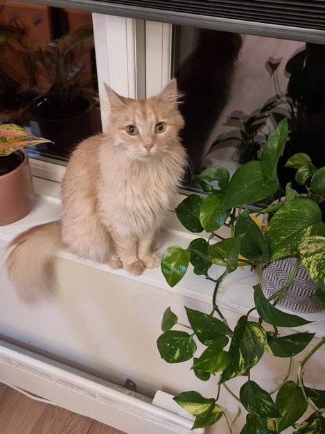 Hun er en liten katt med semilanghåret pels og reagerer godt på navnet sitt. (Freia) hun er chippet og kastrert.
