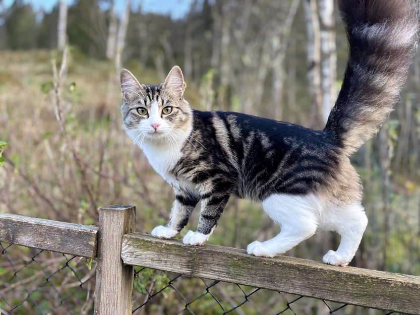 Hunnkatt på 10 mnd. Hun er langhåret, og er brun og svart stripete. Hvit bryst og hvite bakben. Tam og kosete.