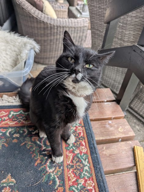 Barneskole jente fikk lokket med seg denne hjem på søndag. Hun møtte den i gamlevegen nedenfor sigrid undsets veg i Lillehammer. De bor ikke langt unna fra der jenta så den, men katten fortsatte å oppholde seg hos dem uten å gå hjem igjen.