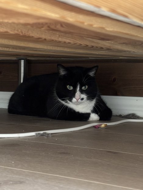 Katten er svart og hvit, med en tydelig svart flekk på snuten. Han er kastrert og omtrent 5 år gammel. Han er rolig og forsiktig av natur, og kan være redd for fremmede og nye lyder. Han er ellers veldig snill og nysgjerrig, men nå virker han stresset og sky.