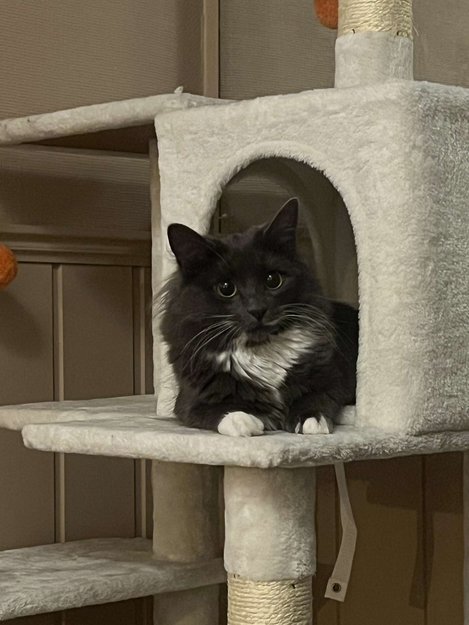 Hun er grå og hvit, med en hvit melkebart under munnen. Hun er veldig aøkende hos andre mennesker og en meget sosial katt som gjerne slår av en prat.