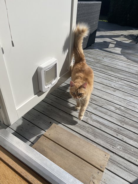 Den 8/5 sto verandadøren åpen og den gikk inn en liten tur. Tok den raskt ut da vi har katt.Prøvd å komme inn katteluken her i hele ettermiddag / kveld.Sitter på utestolen og mjauer og vil inn.