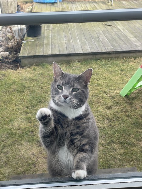 Den ser brun grå ut, men har bengaltegninger når man ser nærme. Hadde et lite nesten grodd sår på høyre skulderblad området. Litt skvetten av seg, men veldig kosete når han er trygg. Veier ca 6 kg .