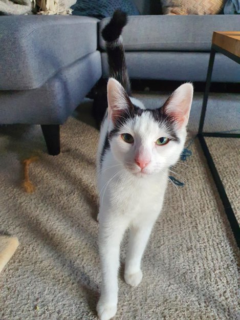 Guri er 10 måneder gammel. Hun er hvit med flere svarte flekker (bla svart hale og tilsynelatende svart “midtskille” på hodet). Hun er ganske sjenert, men også veldig kosete og kontaktsøkende.