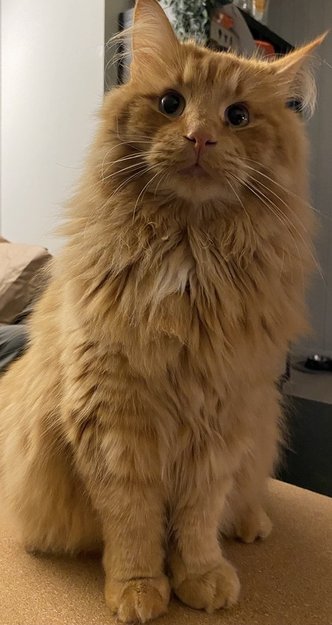 Ramsey er en stor katt med mye pels, han har litt mørkere oransje striper i pannen, han har en liten hvit flekk på brystet og er hvit på tuppen av halen.