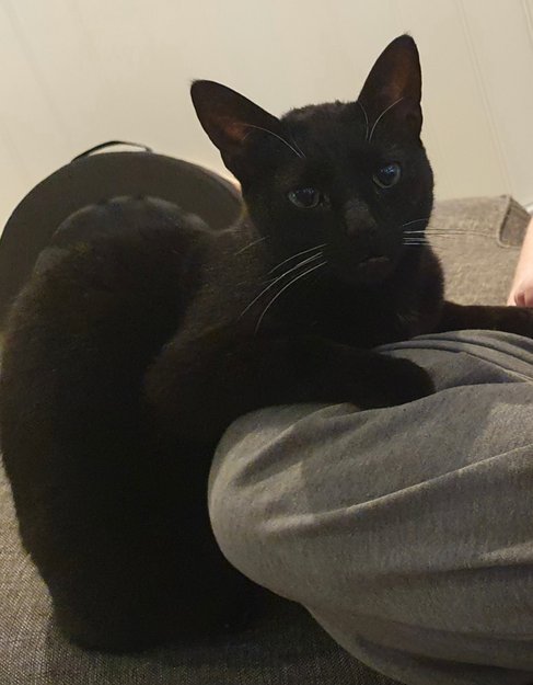 ID tatovering I øret, hvite værhår, hvitflekk mellom bakbena, å noen hvite hår på brystet, gul grønne øyne