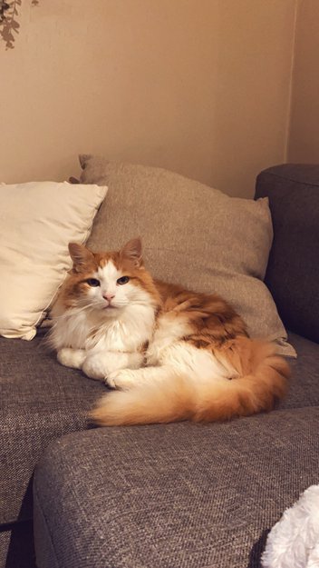 Gul liten hann katt med hvitt i ansikt, bryst og poter. Han har mulig på seg halsbånd med Tracker om han ikke har mistet det. Beskjeden men veldig snill katt. Kan være lettskremt. Reagerer på «ps ps» lyder.
