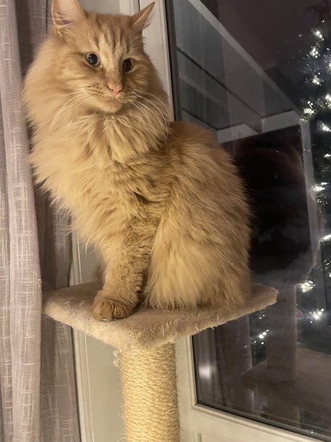Orange løveaktig manke. Langhåret og veldig fin i pelsen.