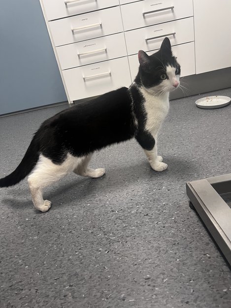Funnet i Gladengveien 15. Levert inn på Evidensia Oslo dyresykehus siden han mulig er observert i flere dager, veldig kontaktsøkende og sulten.