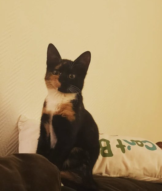 She is small, loud and cuddly. She has a collar with no tags on. The collar is pinkish.
