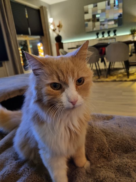 Han har chip, noe skade øverst på venstre øre, helt lys på bryste og rundt snuten og ikke minst en kraftig flott hale. Han har en liten tatovering eller blå flekk øverst på høyre øre.