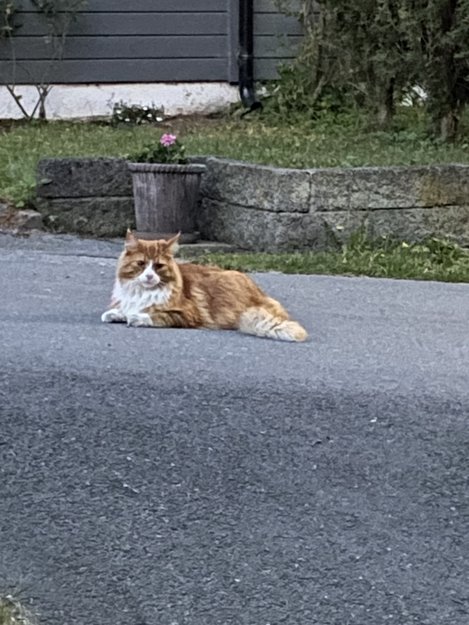 Har en katt her som ikke vil gå, den kommer inn katte luken og spiser og drikker, hviler seg.