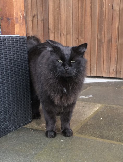 Svart lang pels, snill katt, beskjeden mot fremmede, kan mjaue høyt og mørkt.