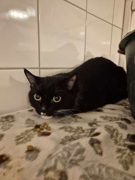 Funnet ved Rubina Ranas gate 12 på Grønland. Katten lå urørlig på bakken, så de som fant katten trodde den var skadet. En av våre frivillige reiste ut og fikk tak i katten, den var redd, men lot seg putte i sekken og fikk den til veterinæren. Heldigvis er katten uskadet, den er bare litt redd.