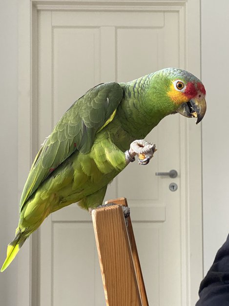 Den mangler negler på stor toa, den har en liten tupp med rød fjær på toppen av nebbet. Den er ringmerket og er ellers typisk utseende for red lored amazon