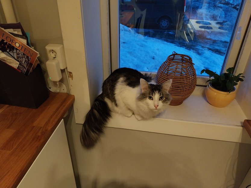Han hoppet ut av vinduet når jeg skulle lufte. Han har nok blitt skremt og gjemt seg for Han var borte før jeg rakk å komme ut for å hente han.