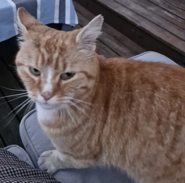 Vi har to katter fra før så den oppsøkte oss muligens for mat. Var sky/redd i starten. Sulten, og veldig var for lyder og raske bevegelser. Er nå trygg på oss, men vi håper å finne eier. Katten bor ikke hos oss, men kommer innom hver dag.