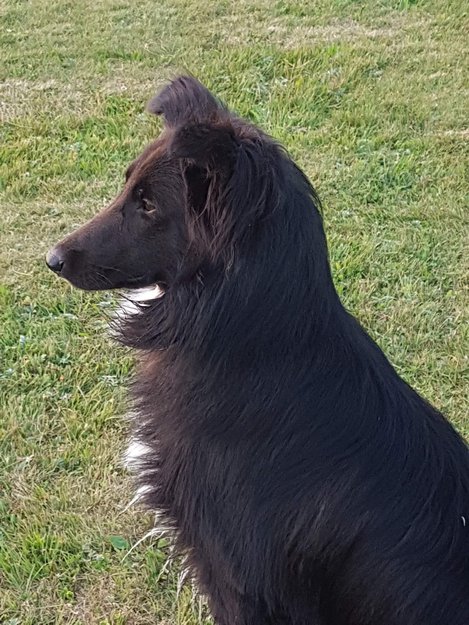 Hvit parti i brystpartiet og på 3 av potene, har ingen halsbånd, er ikke chip merket, er utrolig rolig og vennlig. Skeptisk/små-redd fremmede, spessielt unger og folk med scate-board.