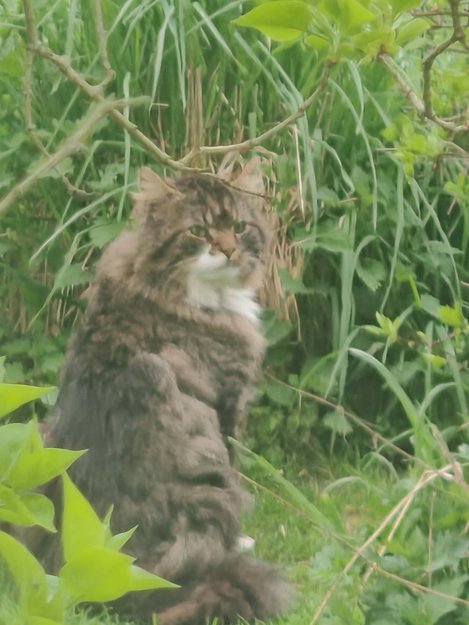 Stor katt med hvit poter, mange floker i pelsen noen går fra ryggen og nesten ned til bakken. Lett å kjenne igjen på flekken i ansikt ved snute.
