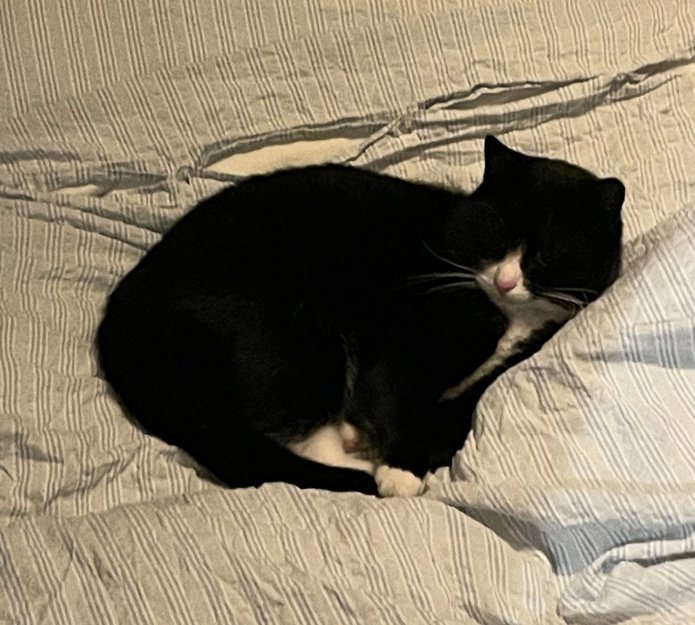 Hun er svart og hvit med rosa nese. Hvit trekant over nese og munn med et hvit belte som fortsetter ned under magen. Hun har også hvite poter. Hun er ei nervøs hun katt som ikke er glad i fremmede.