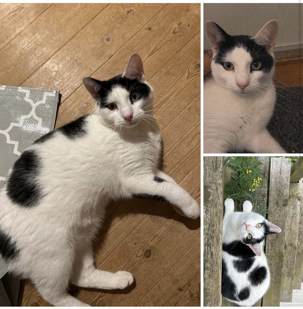 Hvit med svarte flekker. Svart hale. Rosa snute. Halter grunnet en ganske omfattende hofte operasjon i fjor.