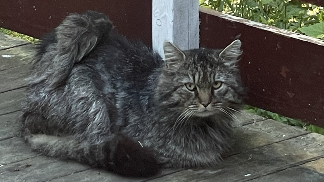 Denne katten holder seg rundt huset her. Han mjauer og søker kontakt, men er sky.