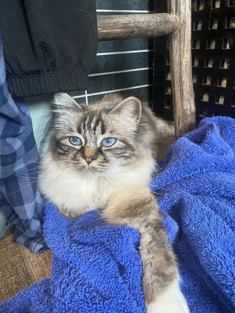 Hun har knall blå øyne og beige pels, med grå striper i pannen. Hun har hvit krage og hvite poter.