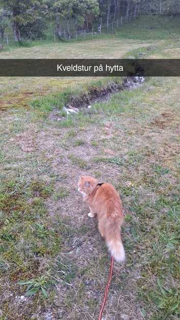 Katten kom seg ut av døren. Når vi skulle hente henne inn igjen ble hun skremt og løp oppover mot neste hytte. Vi mistet synet av henne i lyngen.