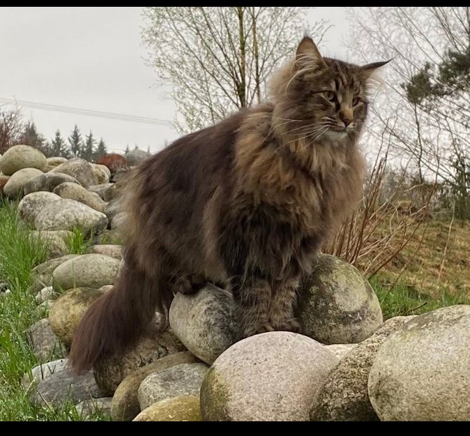 Stor kastrert hankatt med lang pels og lang hale. Store labber. Kastrert og reagerer ofte på navnet Simba. Snill.